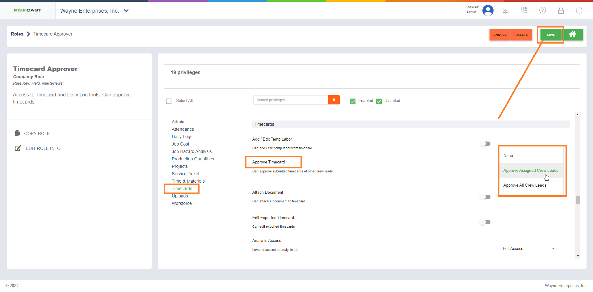 4. Within the timecard section, under “Approve Timecards” privilege, you must select if user is able to: