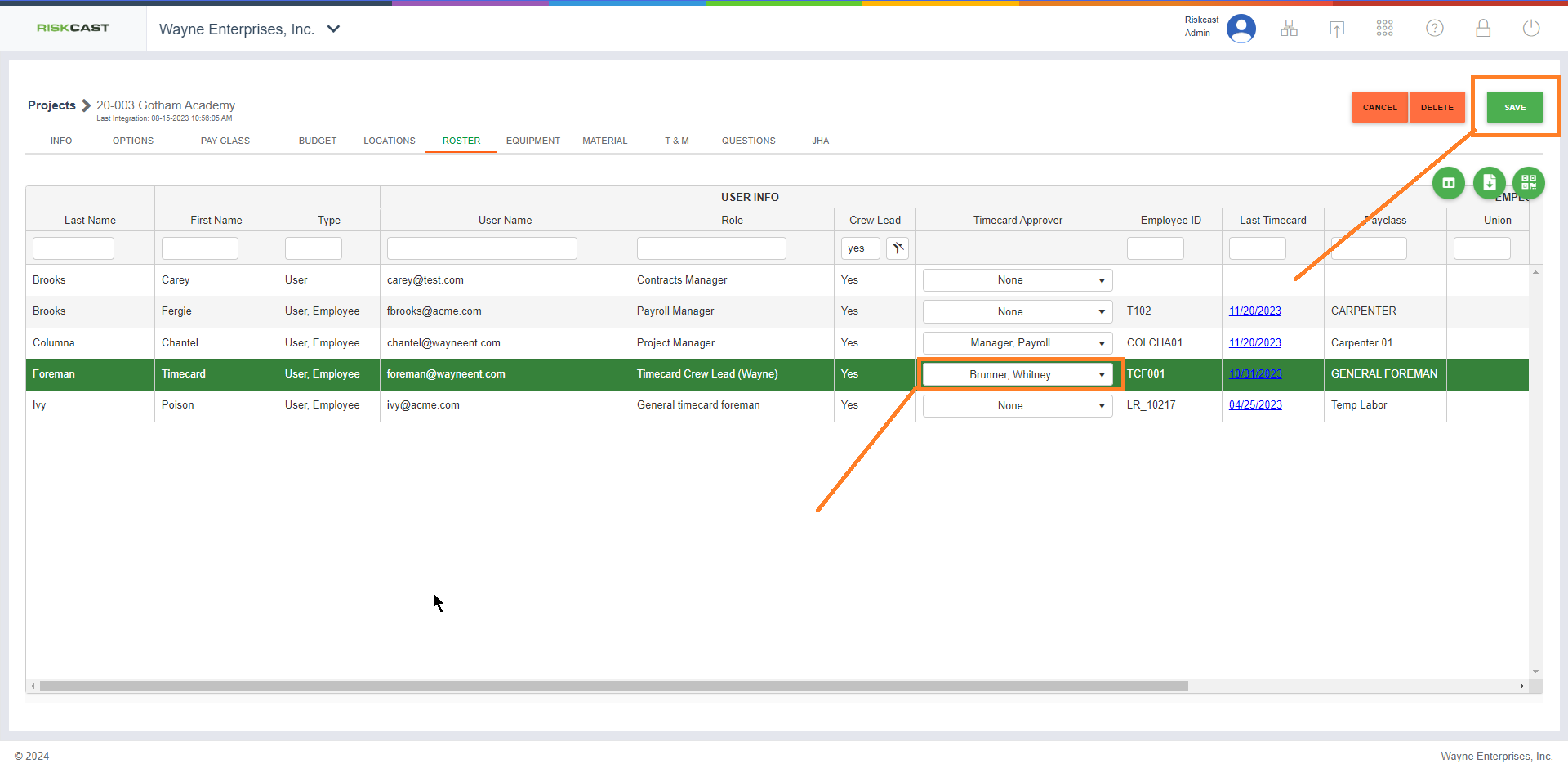 4. Next to each crew lead, you now have the ability to assign an approver. The approver list is generated by the users which have access to approve timecards for the specific job. Click save.