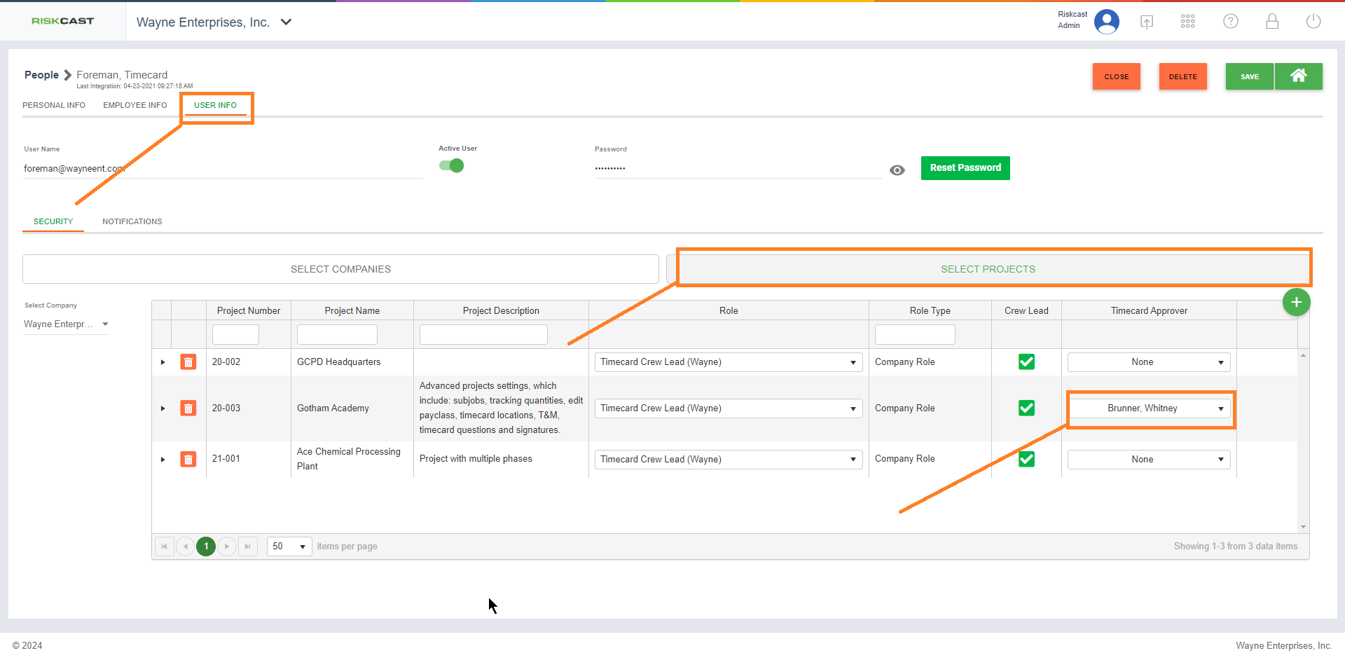3. Within the User Info Tab, Select Project Tabs, and you'll be able to assign approvers from this screen. Click Save.