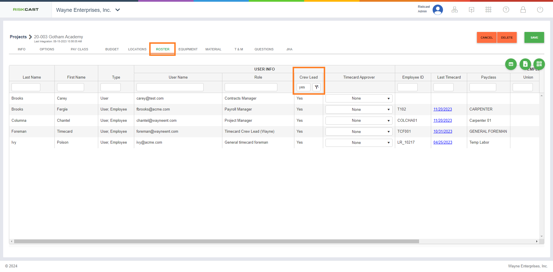 3. Select the roster tab, and filter your view by who is a crew lead on your project.