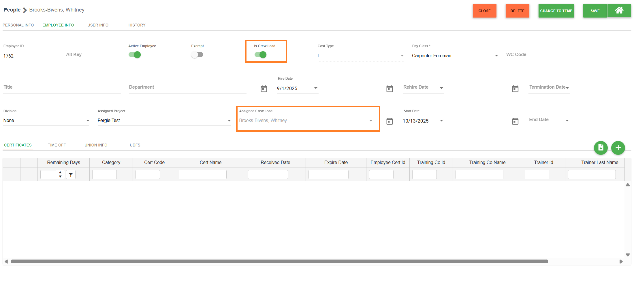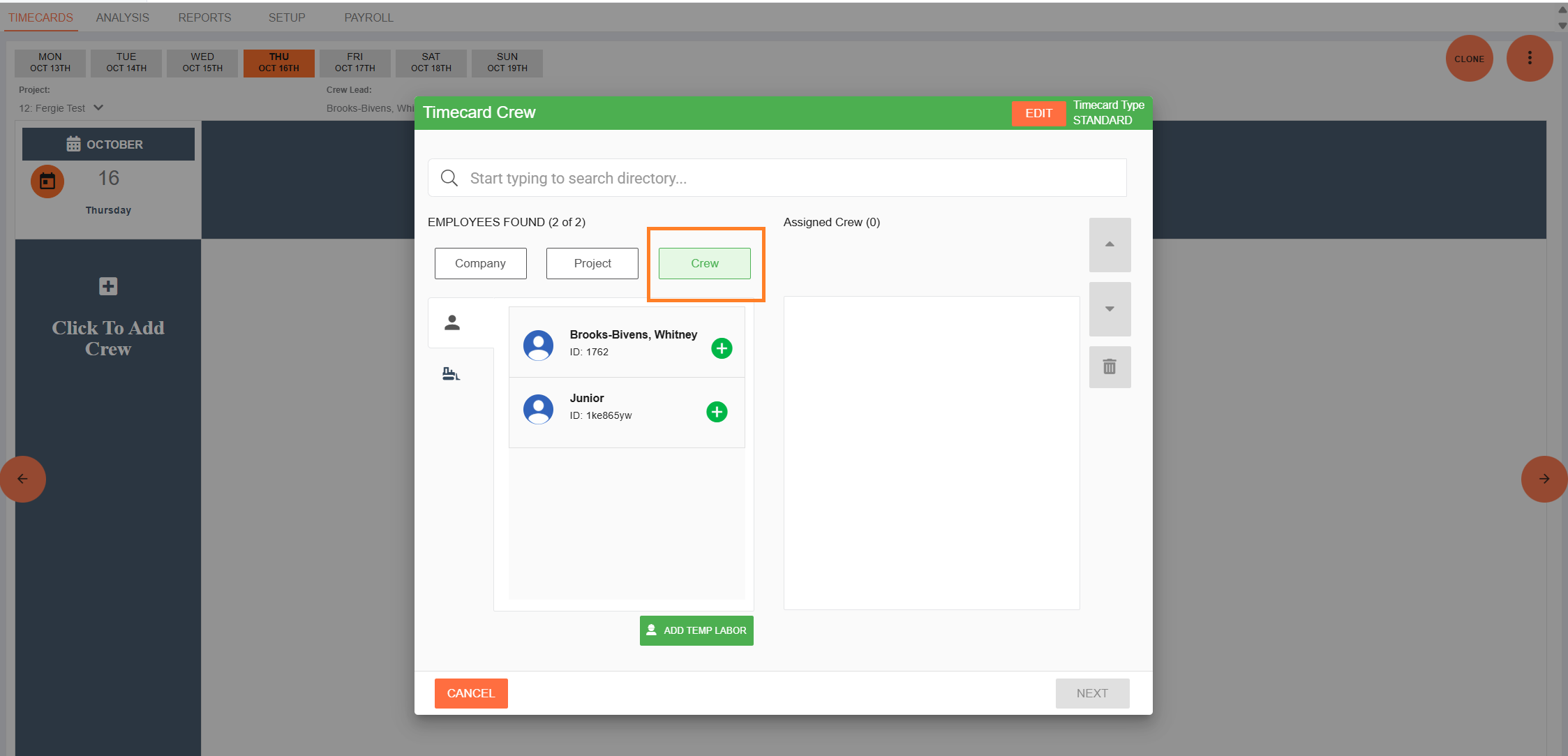 For the Crew Lead Roster, within an employee Record, and employee can be designated as a "general" crew lead. Once an employee has that designated, other employees and equipment can be "assigned" to that crew lead via the "Assigned Crew Lead" field within the employee record. If that is used, then the Crew Roster option on the timecard selection window will be available to crew leads who do have employees or equipment assigned to them within Riskcast. If the timecard crew lead has no assigned crew members, they will not see the Crew option on the timecard crew selection window.