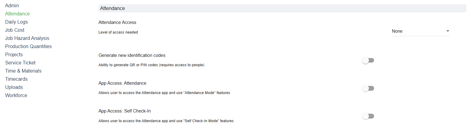 This permission defines the overall level of access a user has to the Attendance module within the Riskcast web application. The Riskcast web application shows all check in and check outs as well as times, answers to questions, photos, etc.