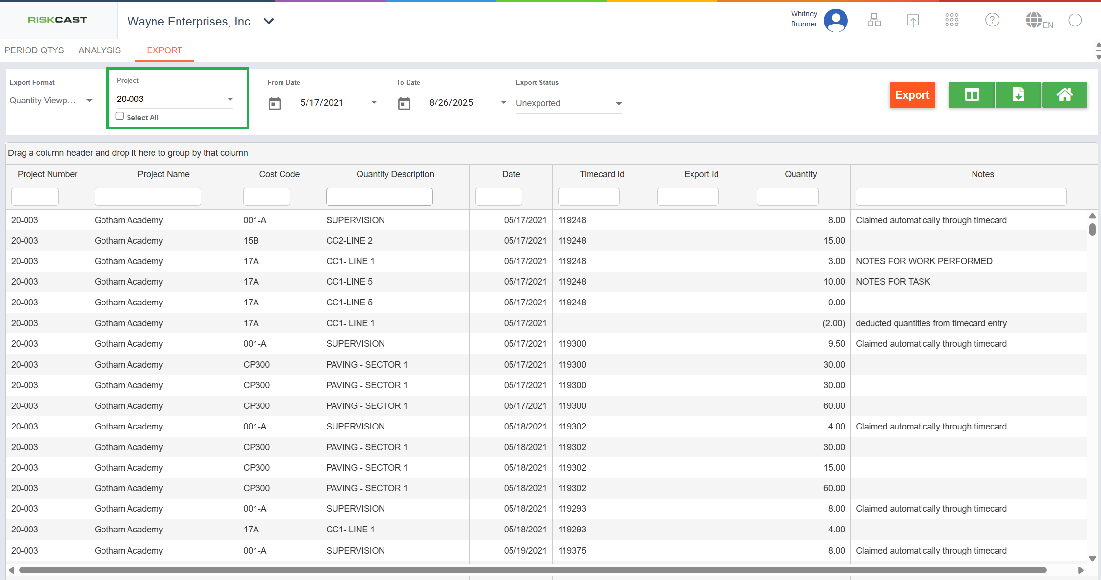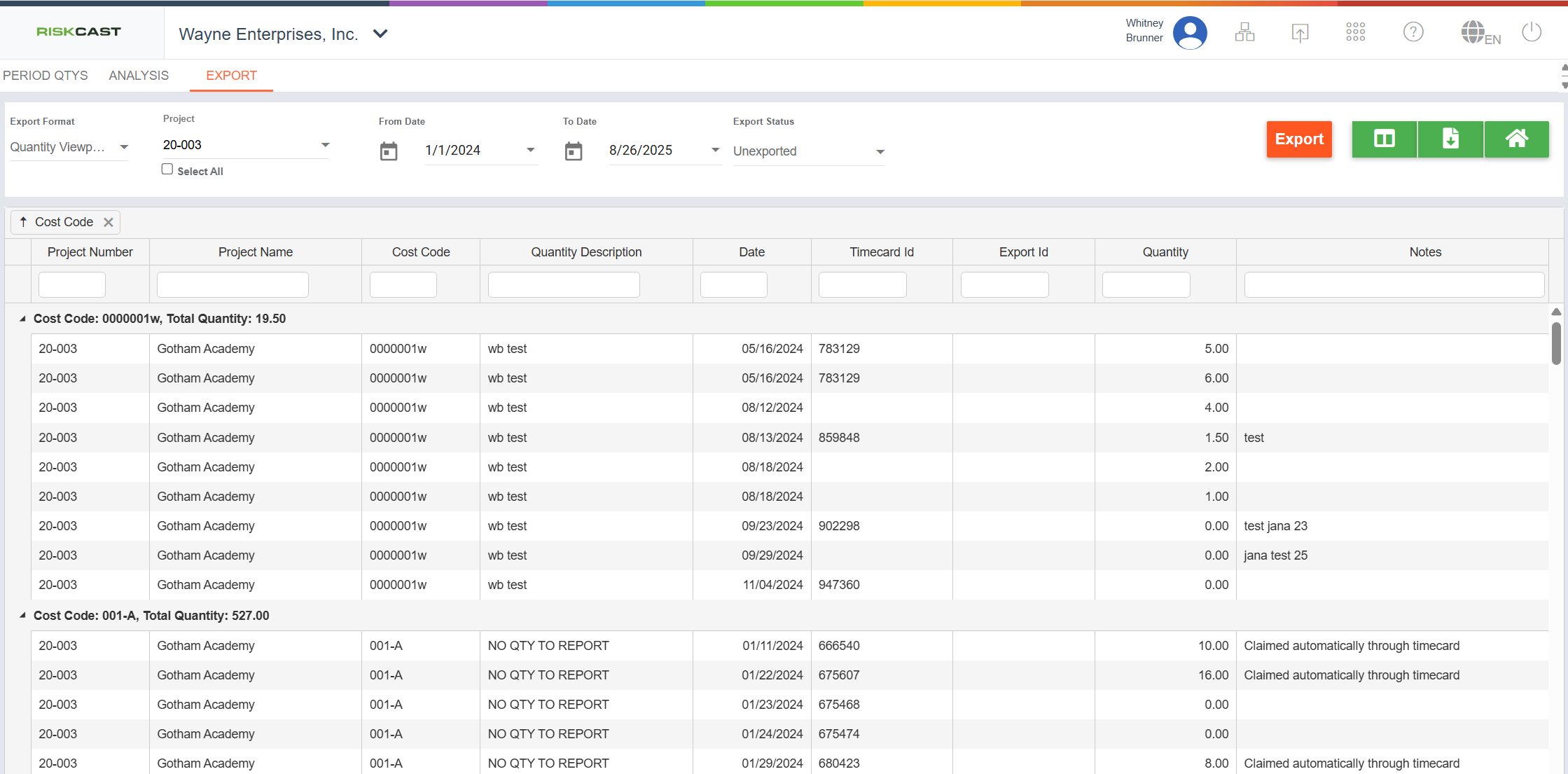 All unexported transactions will show, both those created from a timecard or those created directly within the Production Quantities module. The user can review the data being exported in this screen by grouping and sorting the columns as needed.
