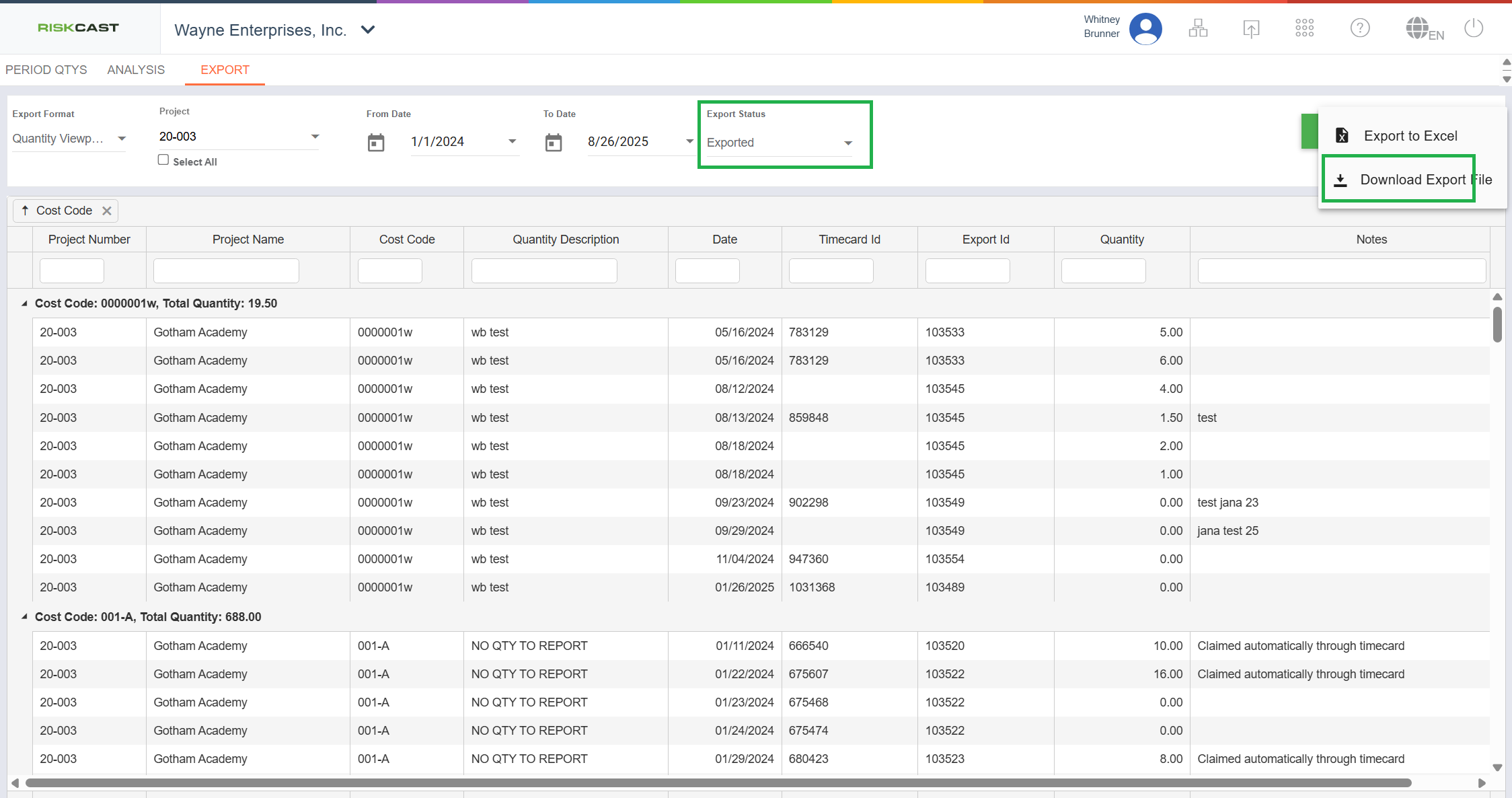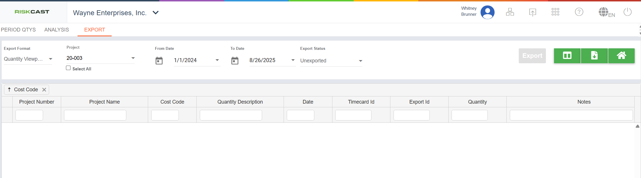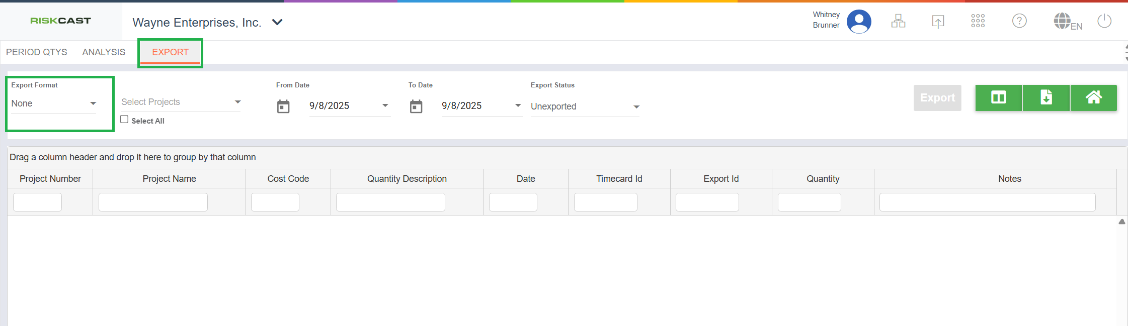Clicking on the "Export" tab brings the user to the screen below. Please note that if the 'Export Format' drop down defaults to 'None', a Quantity Export file has not been set up for the company which means the 'Export' button will be read-only and this process cannot be continued. To have a Quantity Export file set up, please have the company's Riskcast Administrator e-mail [email protected] and/or your customer service representative.