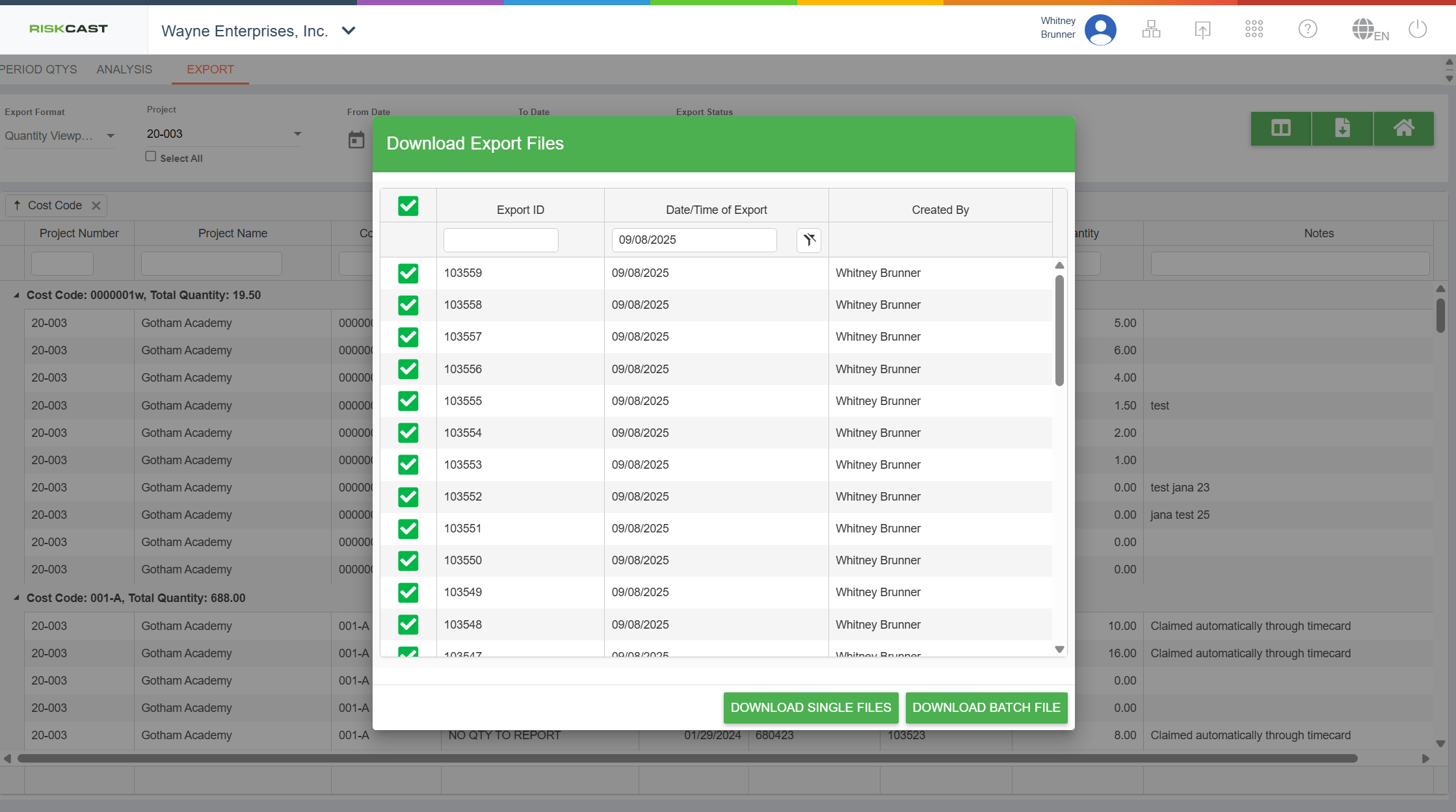 A pop up window called 'Download Export Files' will appear. Select the file and choose whether single or combined files per project per week ending date are wanted.