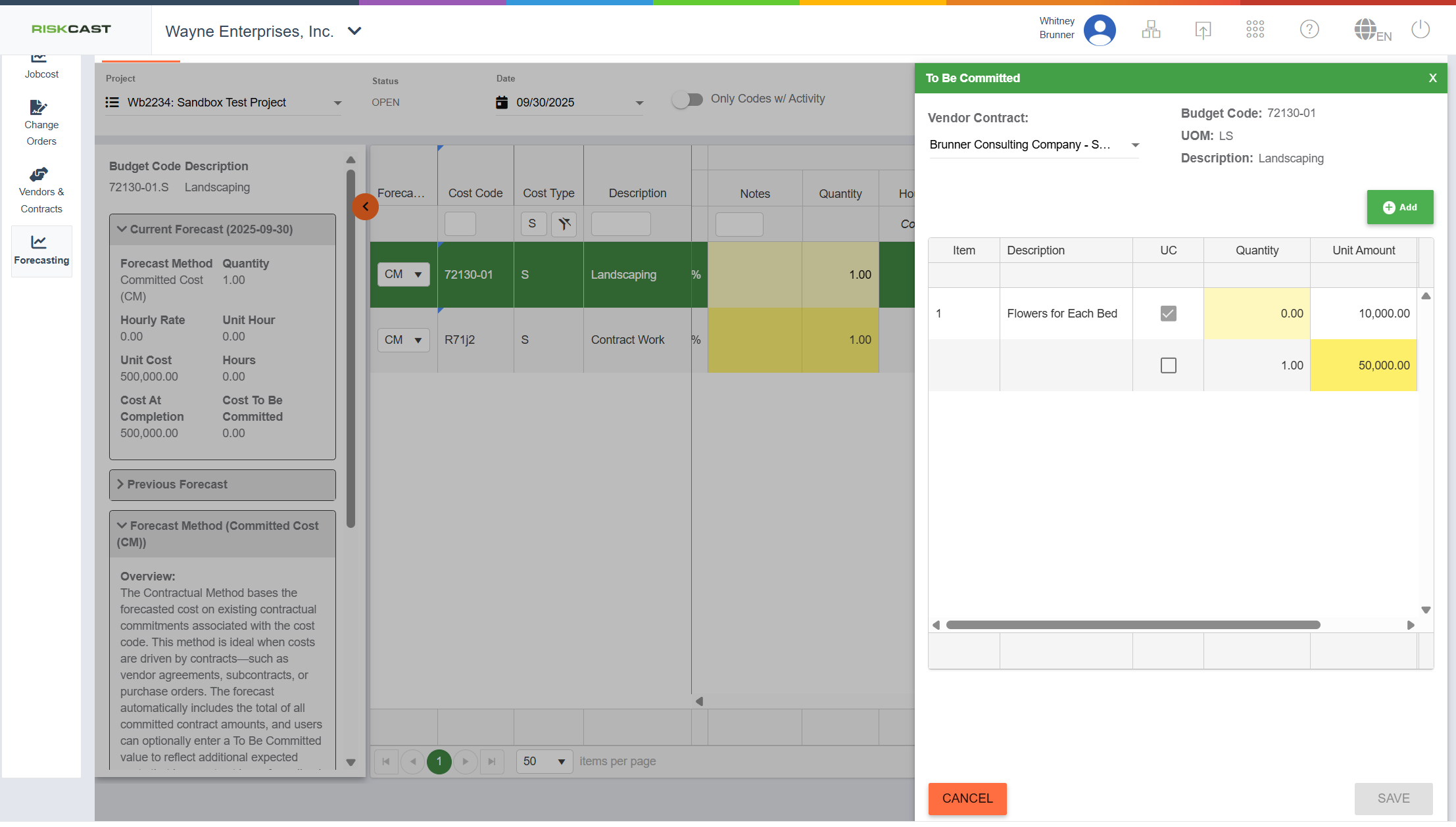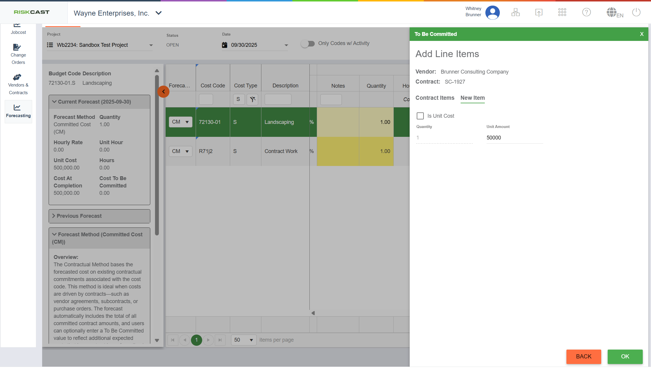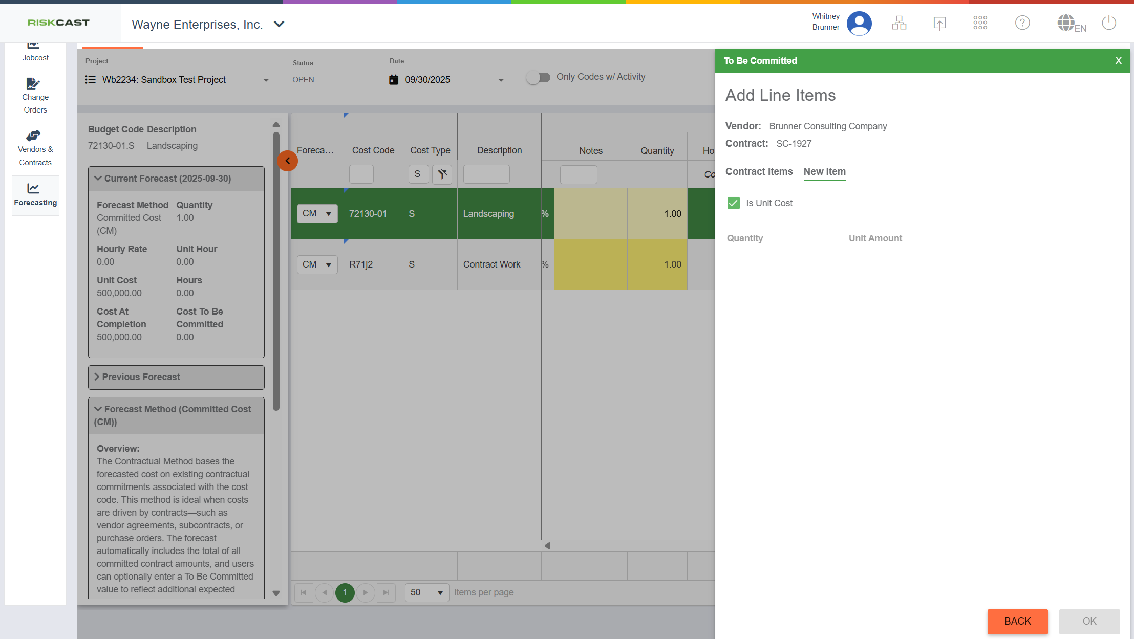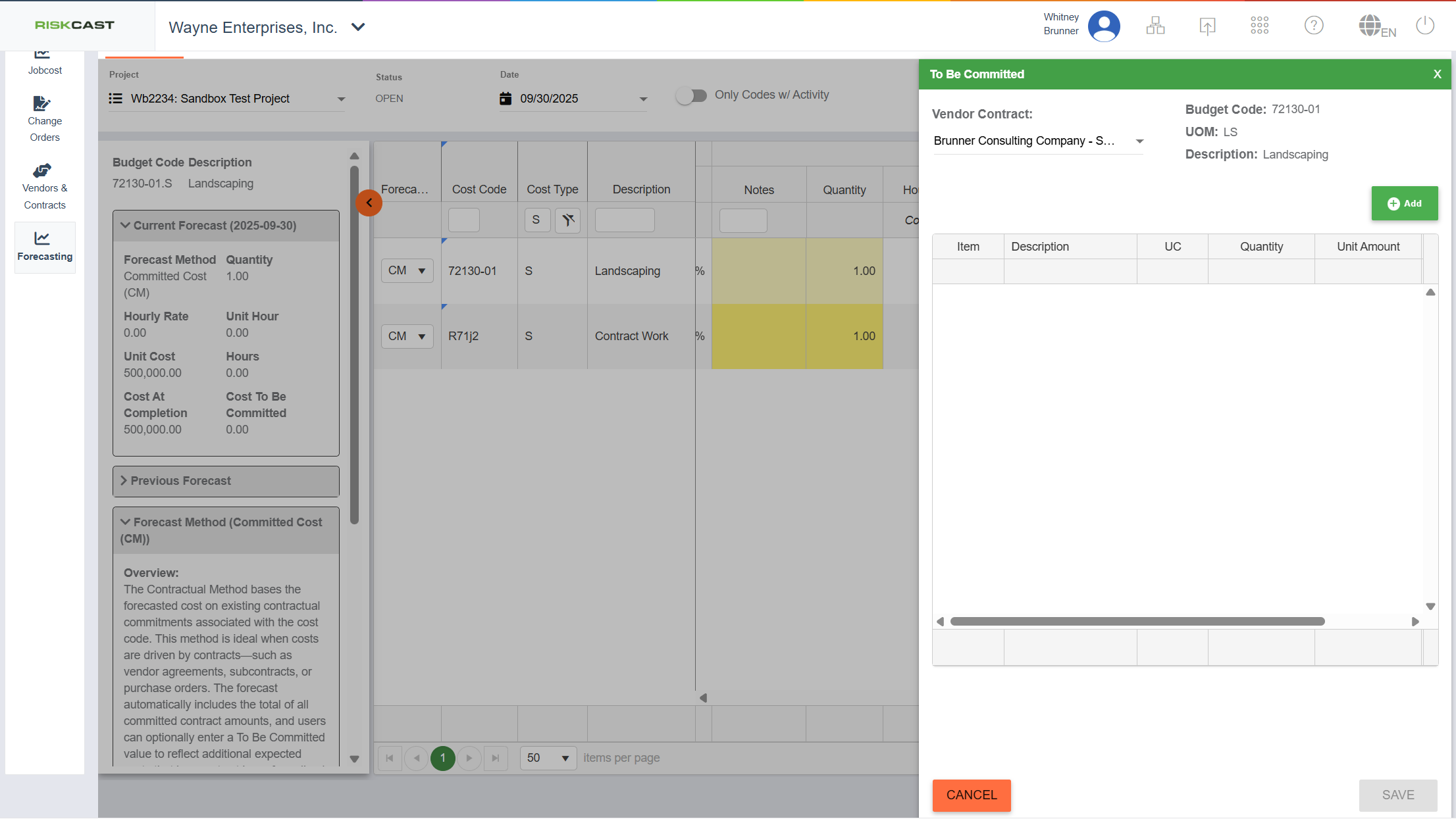 Note: The Vendor Contract will fill in by default if a contract already exists that is tied to the cost code. However, uncommited cost in Riskcast is not tied to a contract or a vendor, but instead, strictly tied to this cost code for forecasting purposes only.