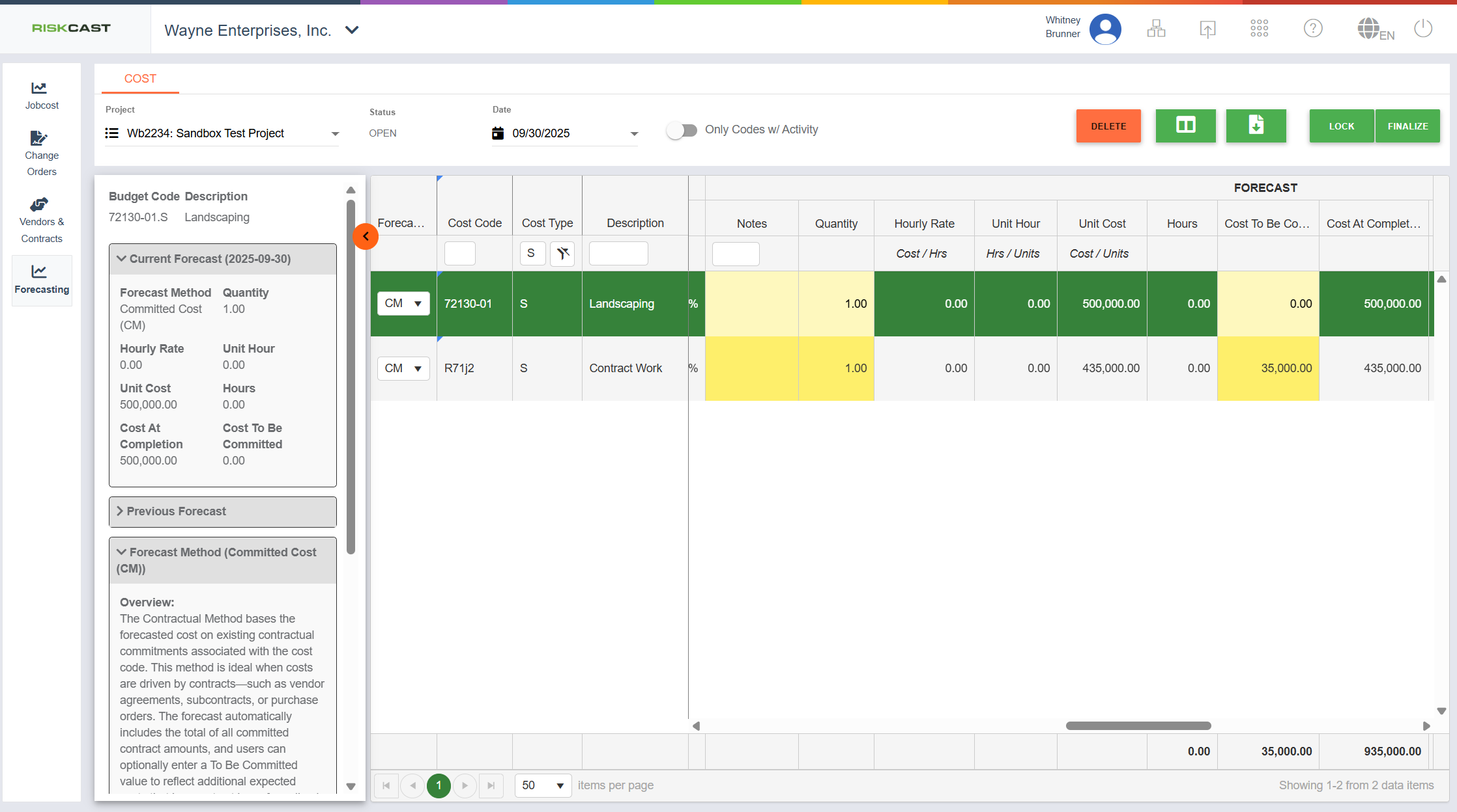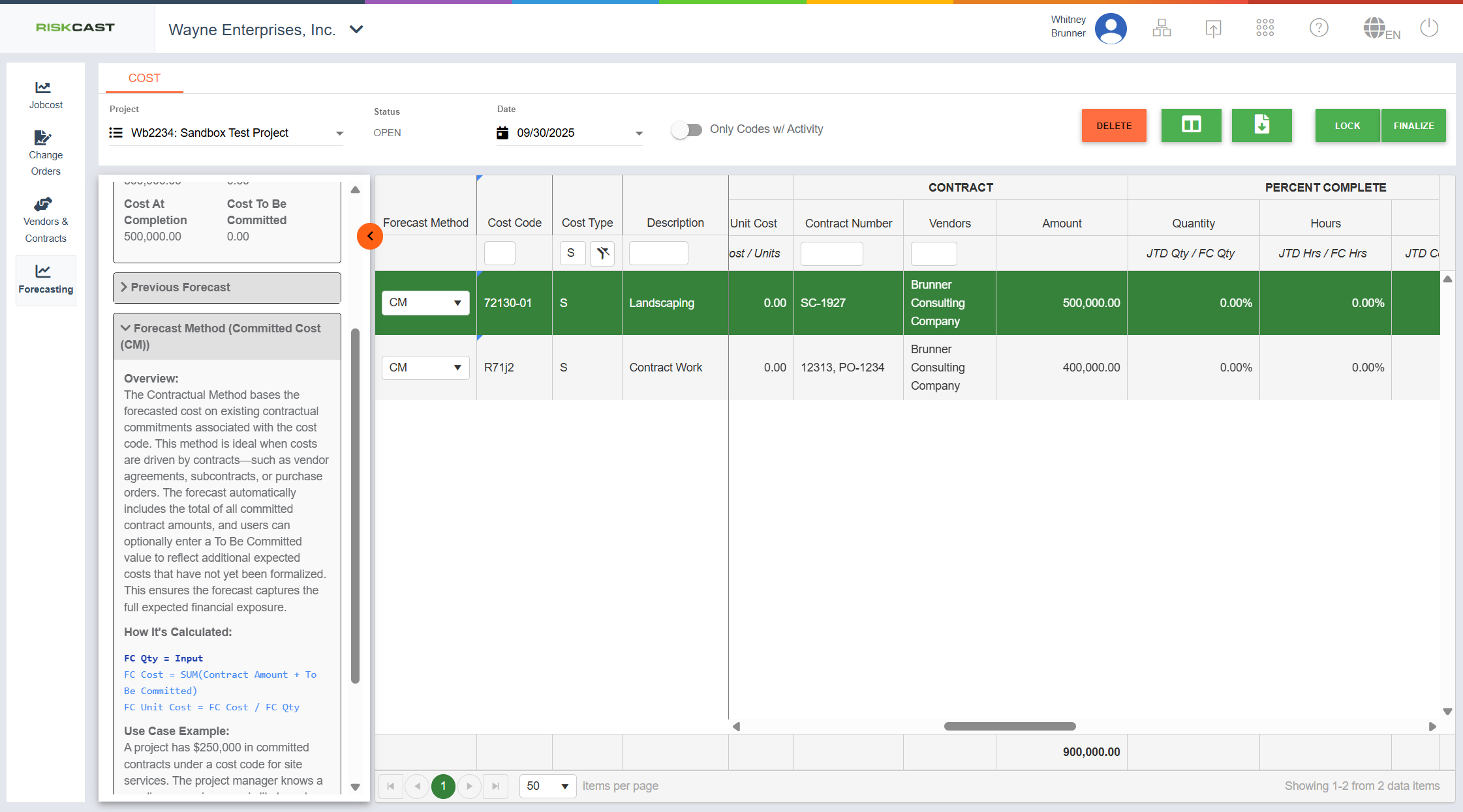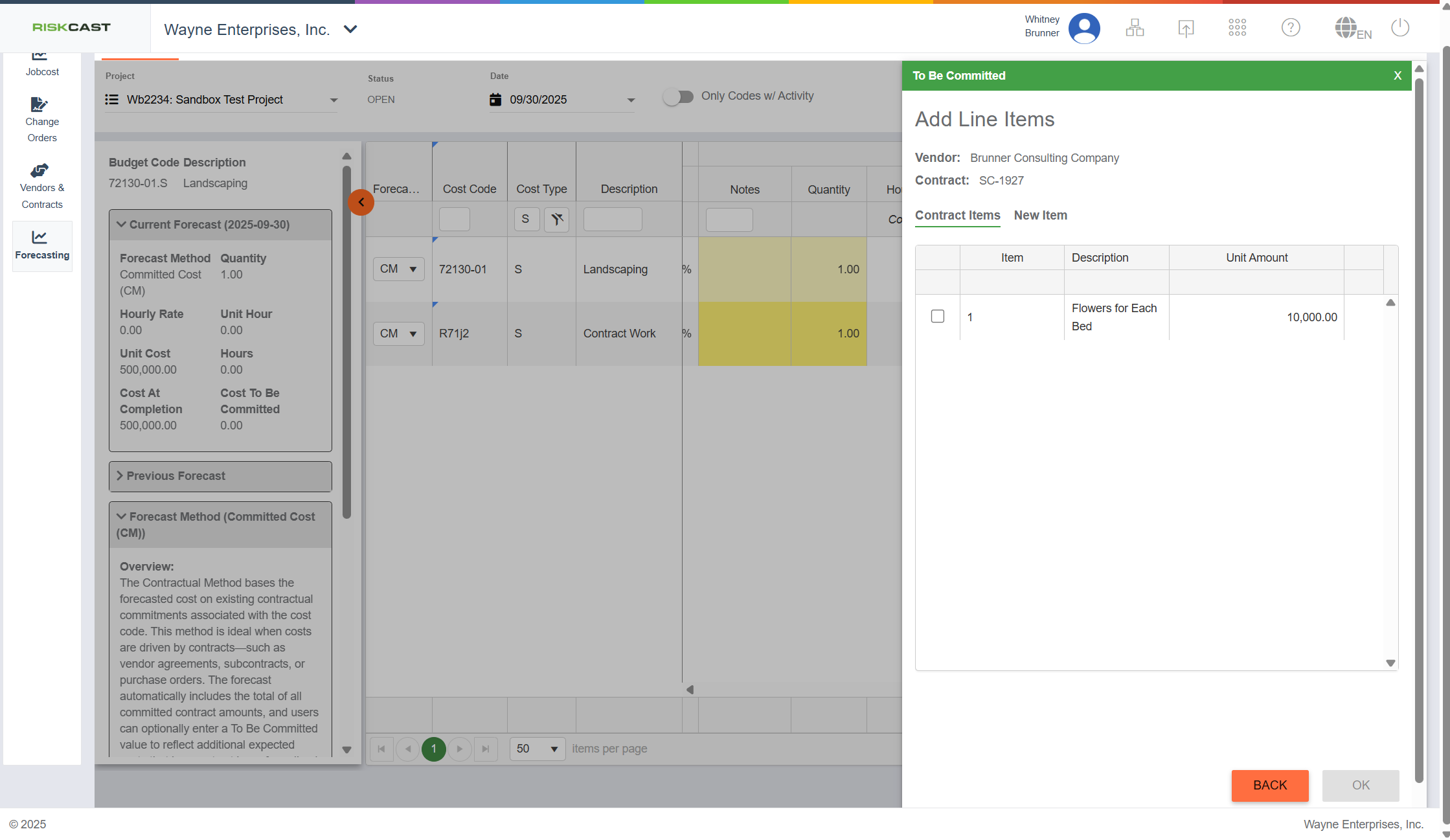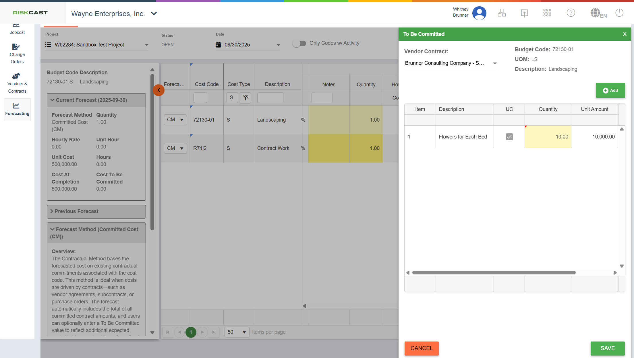Note: The Vendor Contract will fill in by default if a contract already exists that is tied to the cost code. However, uncommited cost in Riskcast is not tied to a contract or a vendor, but instead, strictly tied to this cost code for forecasting purposes only.
