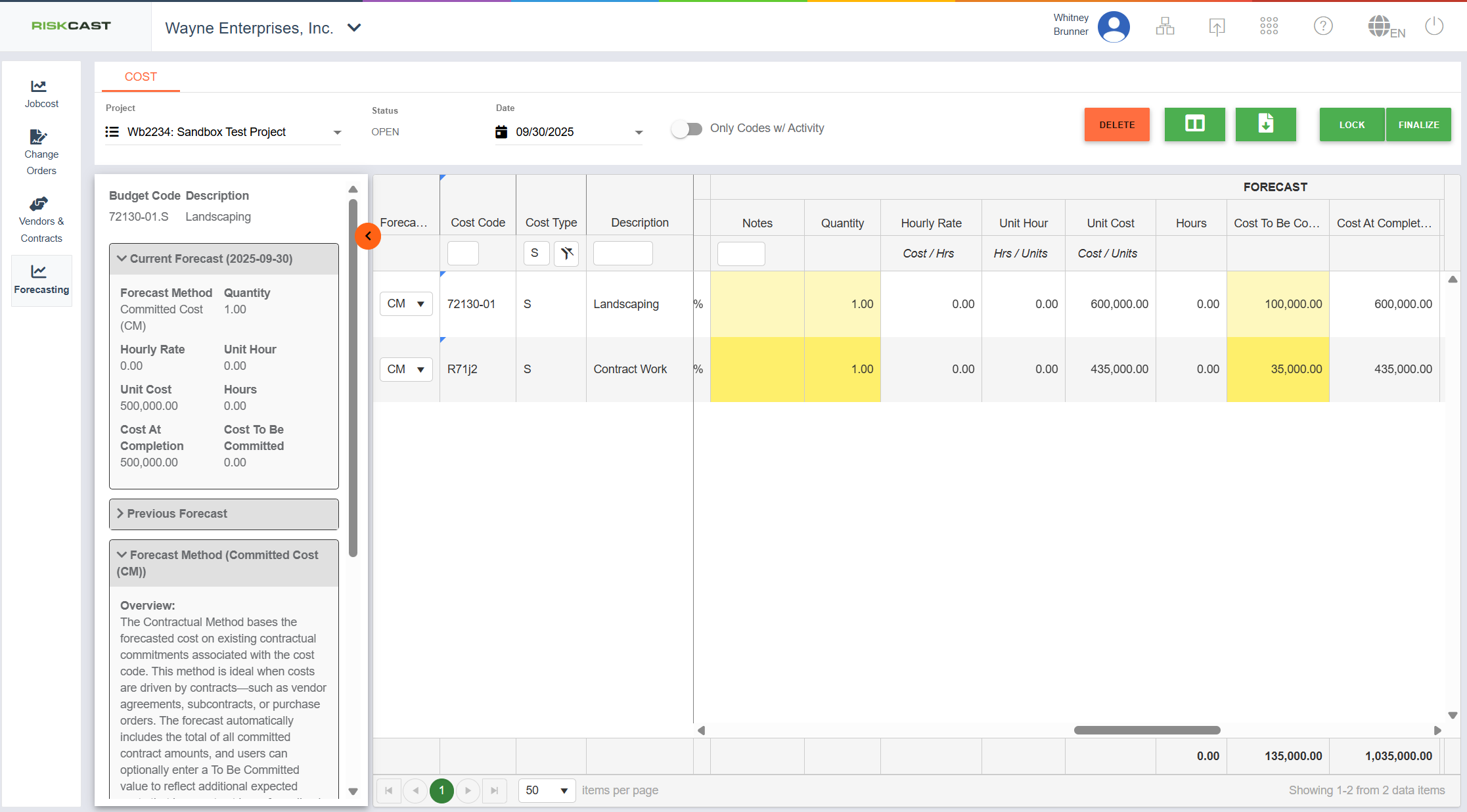 Note: As mentioned above, these "uncommitted" line items are not actually related to a contract in Riskcast. When and if these uncommitted costs become realized and assigned to a contract, these values will need to be manually changed to "0" in the To Be Committed sidepanel since they cannot be deleted. Once the side panel is closed, the total of the side panel is evident in the "Cost To Be Committed" field for the selected cost code. The "Cost At Completion" for the cost code will be the Contract Value + the Cost To Be Committed.