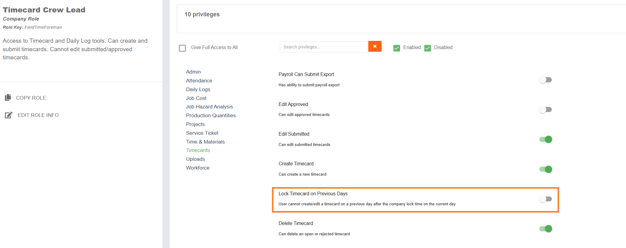 If a user has this permission level toggled ON, then this is what a previous day timecard would look like for that user.