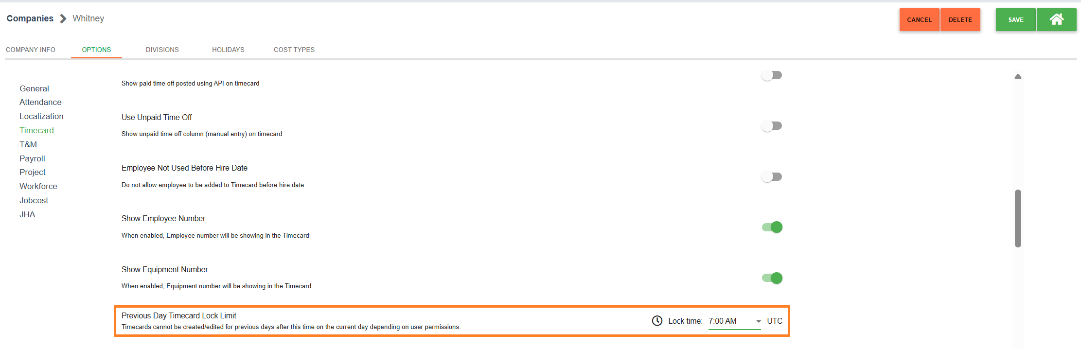 Within each company, an option exists at the company level within the timecard level to set a time at which previous days timecards will lock for creation/editing depending on user permissions. By default, this lock time is set at 7:00 AM for the time zone selected within the Company Info tab.