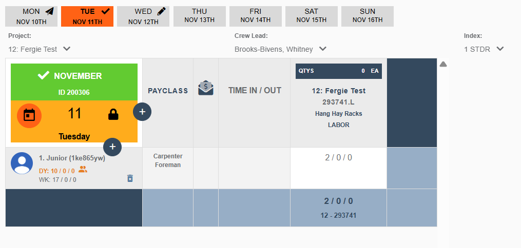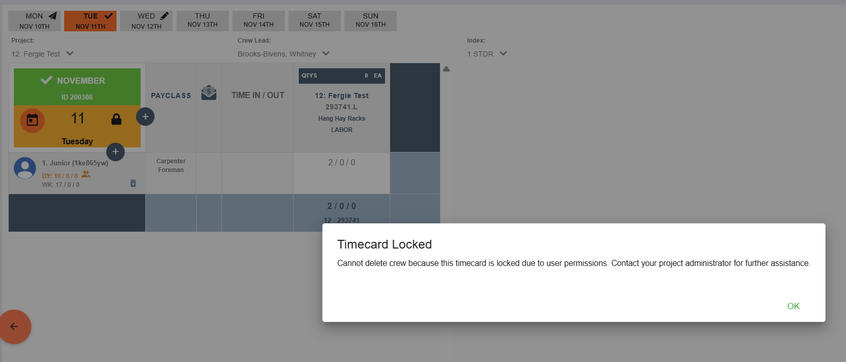 Note the orange/locked designation in the top left corner. Additionally, any clickable buttons (editing crew, cloning, etc) will deliver a pop up message letting the user know that the timecard is locked due to user permissions.