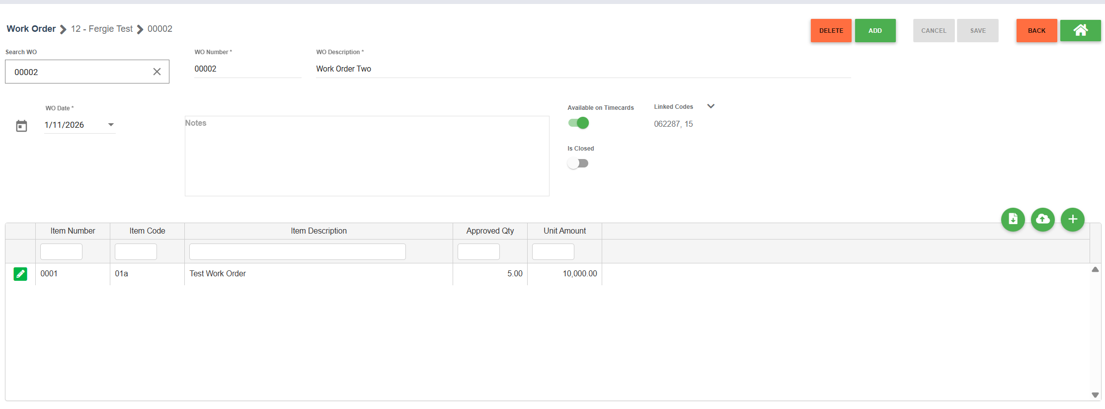 Once the work order is created, a user can add individual items to the work order. A user can also define with the "Available on Timecards" toggle, if a user can see this work order on a timecard.