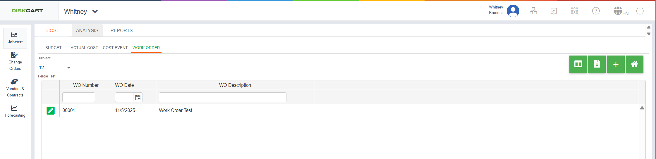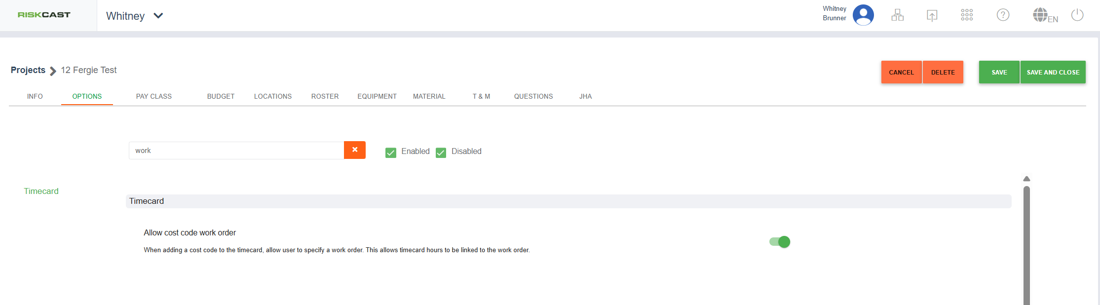 Riskcast allows projects to select whether they want to enable the ability to use Work Orders. Within the Project module, within each project options screen, toggle ON the "Allow cost code work order" option.