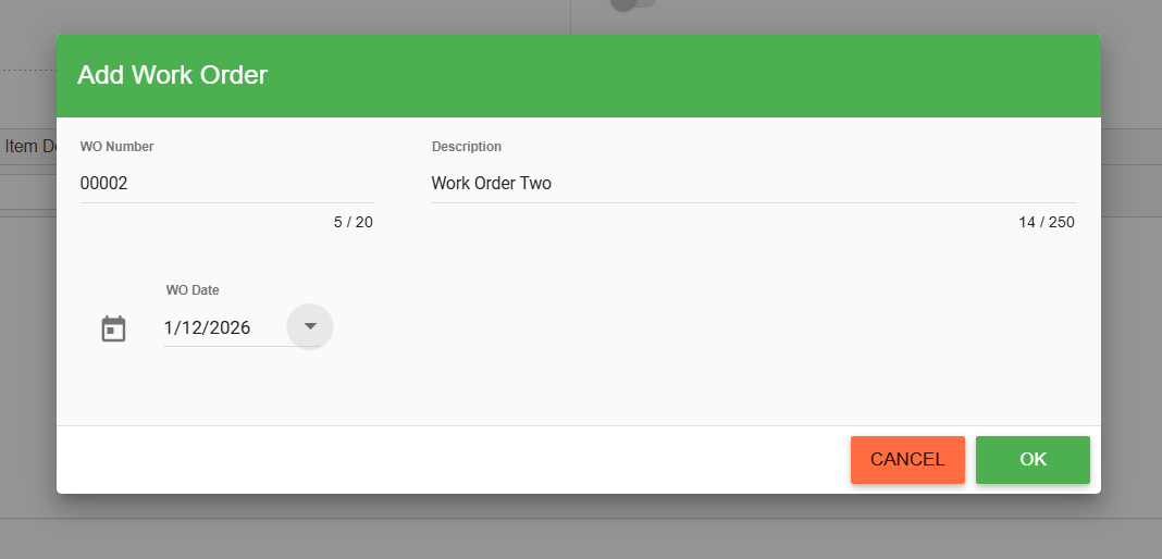 When adding a new work order, the WO number will automatically generate sequentially. It can be changed if needed. The user needs to enter a WO Date and Description before clicking OK.