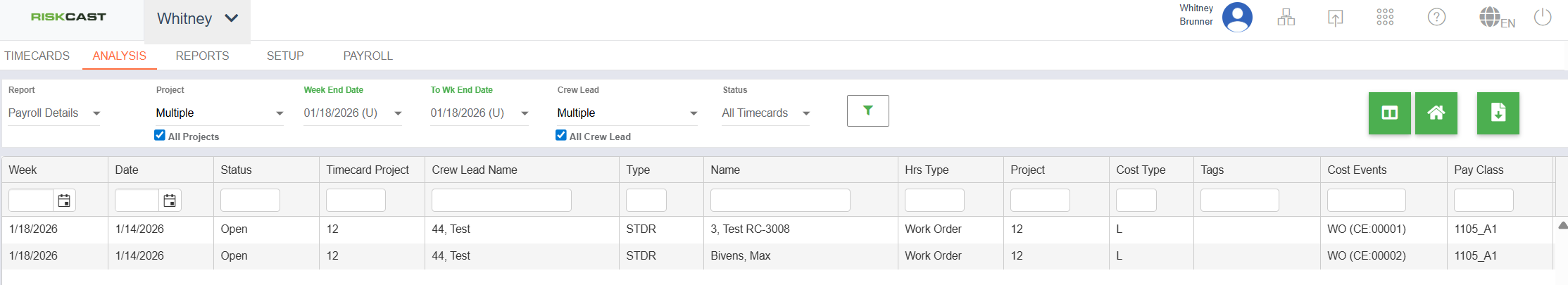 To see what has been charged against a work order, navigate to the Payroll Details section of the Timecard Module/Analysis tab. The "Hrs Type" will be "Work Order" and the "Cost Events" will note that its a work order and the "CE:000xx" is actually the number of the work order.
