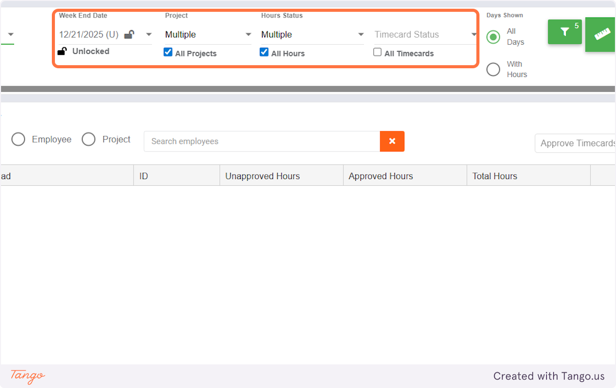 Step 6: Apply Filters Use filters as needed to narrow down the list of timecards (for example, by project, date range, or status).