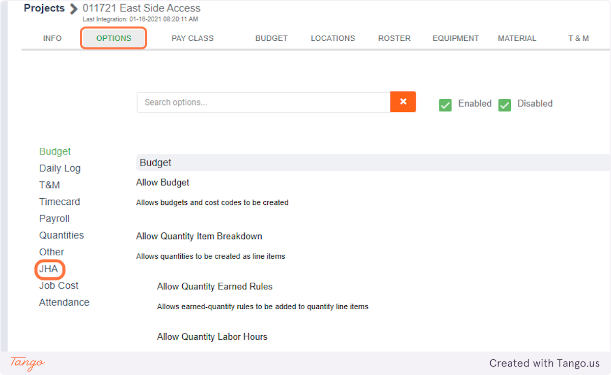 3. Click on OPTIONS and JHA