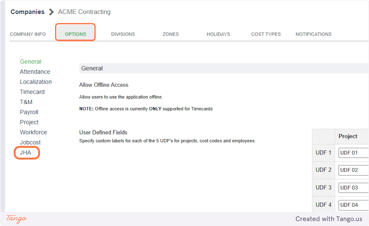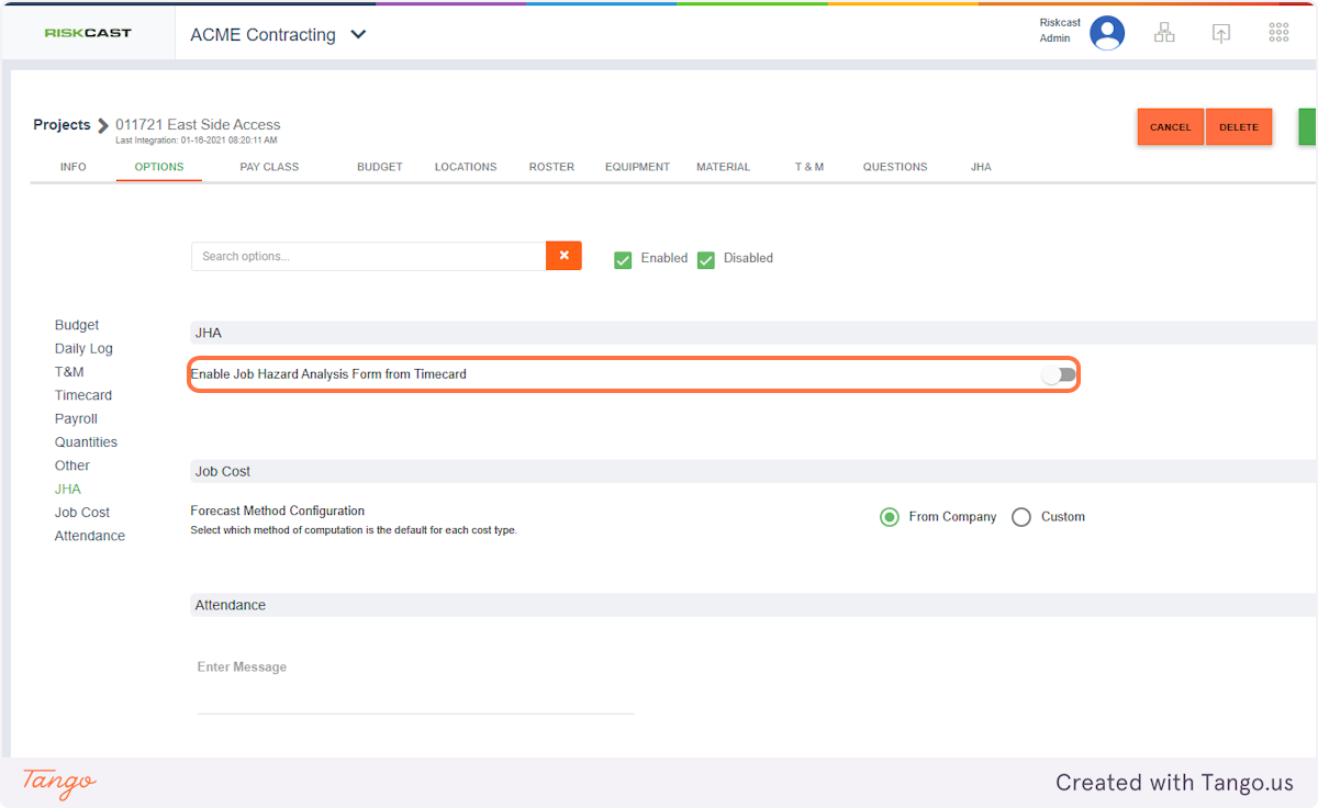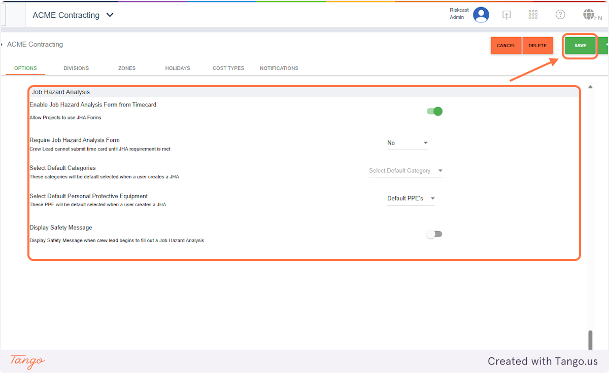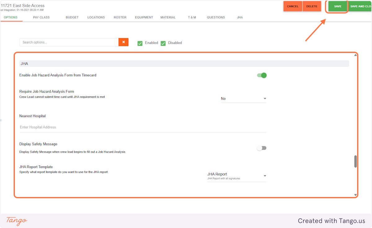 4. Enable "Job Hazard Analysis Form from Timecard"
